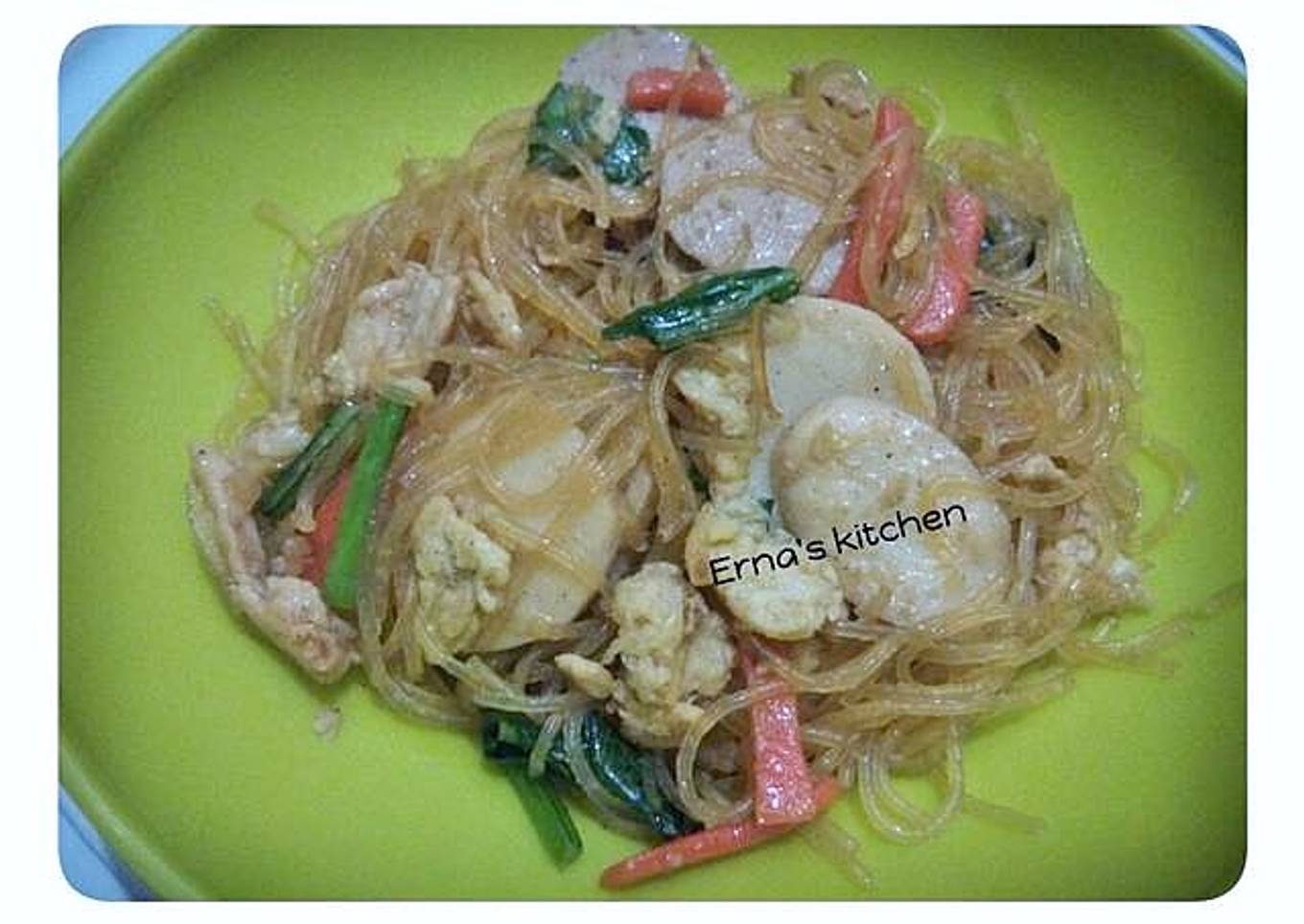 - Rendam bihun jagung sampai lembut, tiriskan. Lalu beri 1 sdm minyak goreng dan 2 sdm kecap manis. Aduk2 sampai rata. Sisihkan
