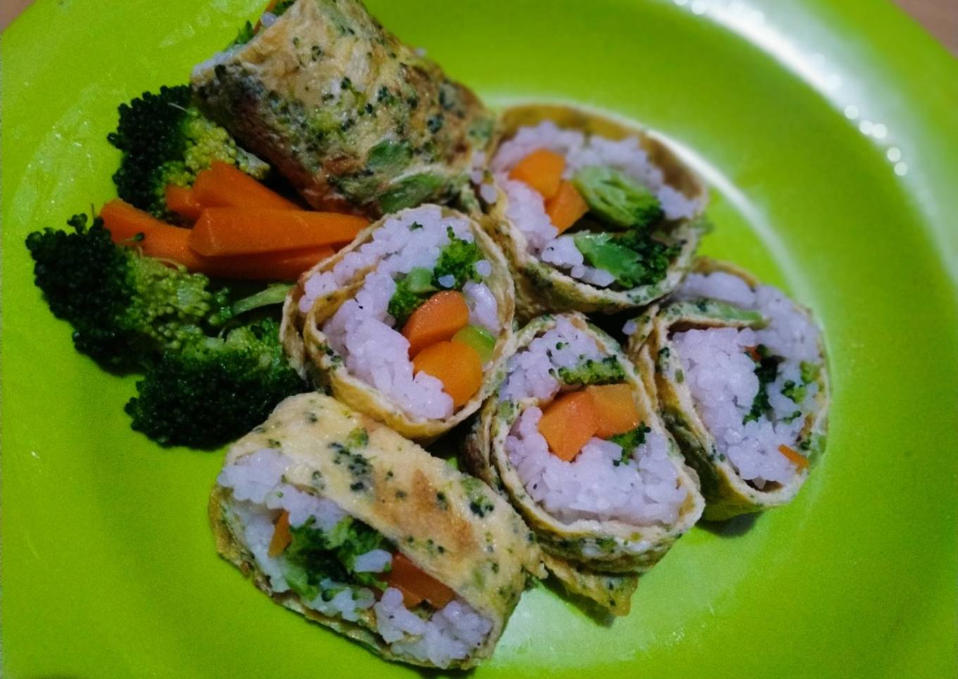 - Jika semua sudah lalu ambil telur dadar yang sudah matang tadi lalu taruh nasi ratakan dan taruh wortel serta brokoli yang sudah direbus tadi, dan gulung.