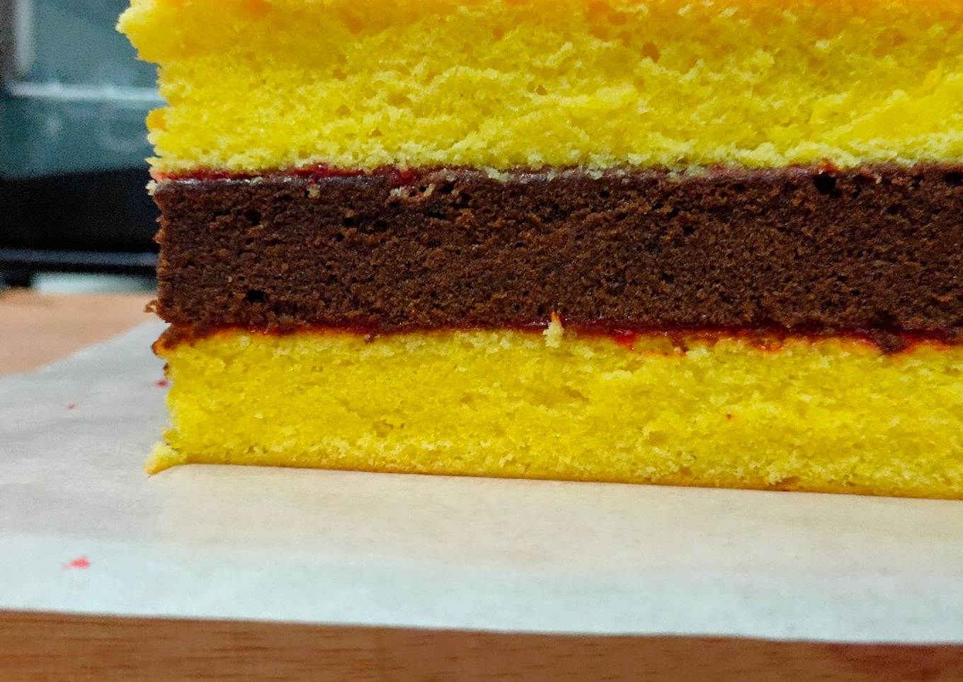 - Setelah semua lapis dingin, oleskan selai strawberry secara merata di lapisan kuning, kemudian timpa dengan lapisan coklat. Oleskan selai diatas lapisan coklat secara merata kemudian tutup dengan lapisan kuning lagi.