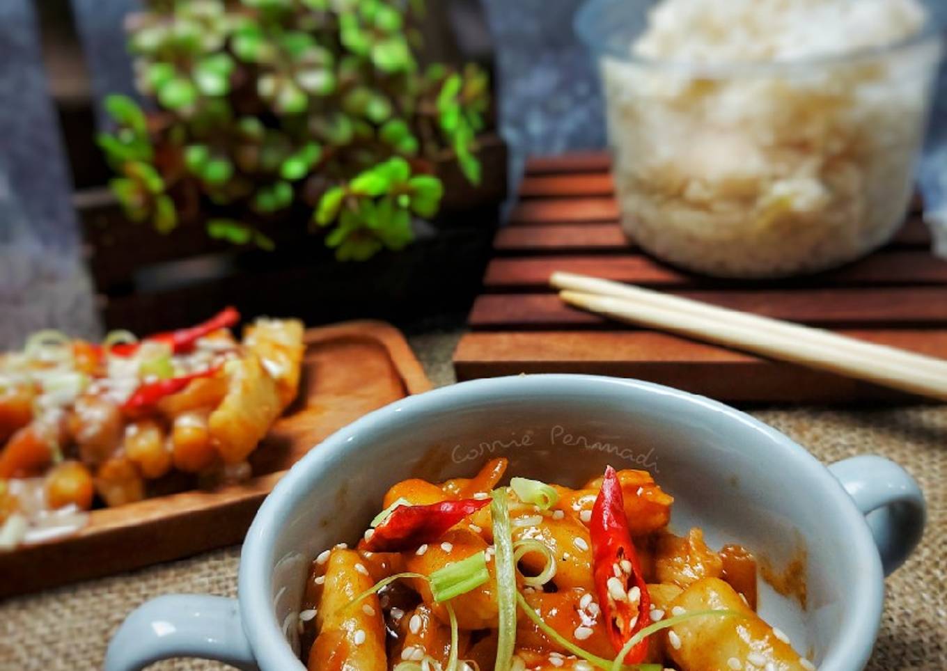 - Selanjutnya panaskan minyak dalam teflon, tumis bawang bombay kemudian bawang putih. Setelah harum tambahkan air dan masukkan saos tiram,saos tomat,minyak wijen,gula,garam,dan kaldu bubuk. Aduk rata dan biarkan mendidih.