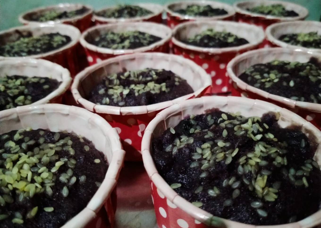 - Jika sudah Kalis, masukkan adonan kedalam wadah cupcake dan taburi dengan biji wijen.