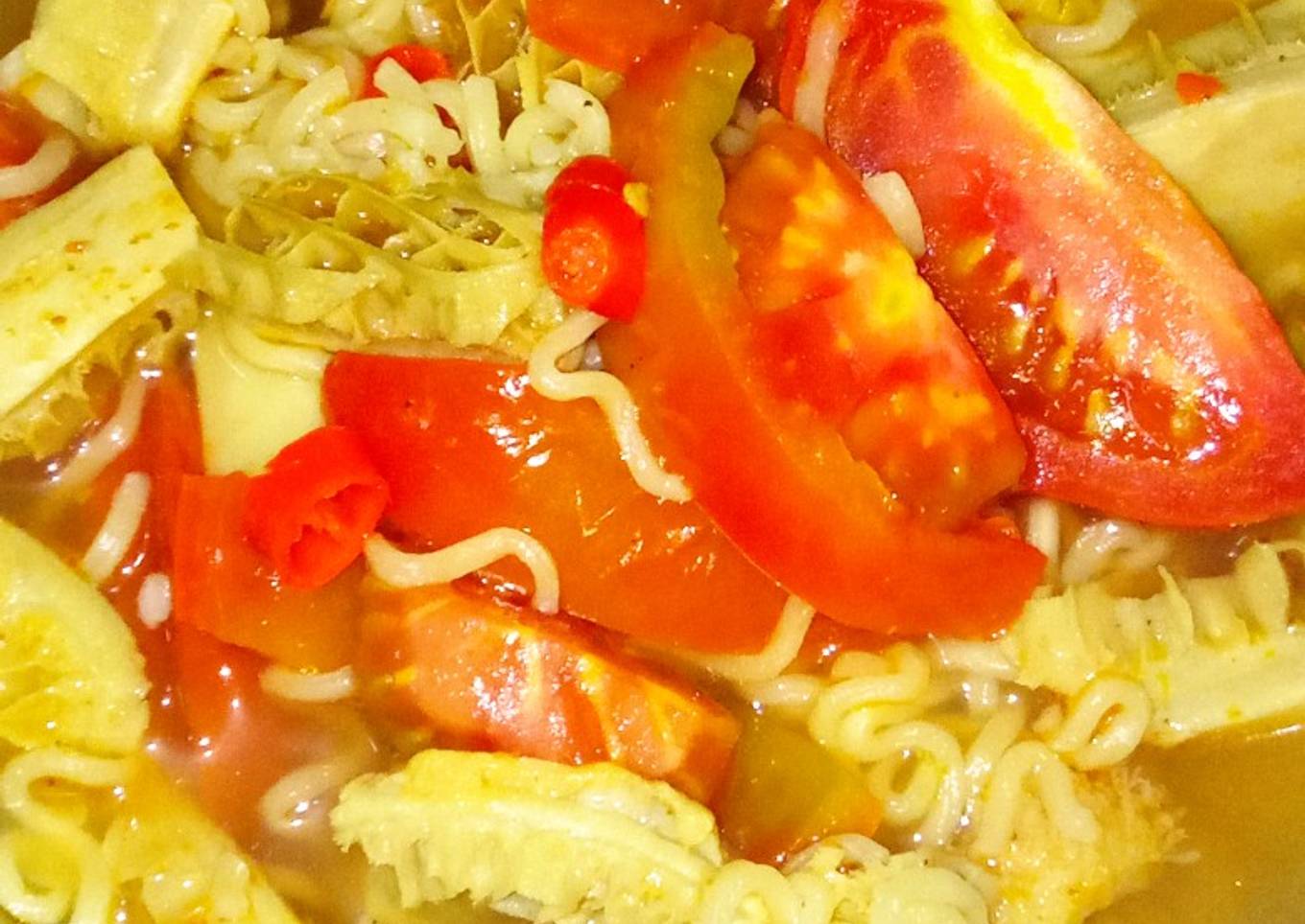 - Masukkan irisan tomat dan bumbu mie instan, tambahi garam jika kurang bumbu. Masak hingga tomat matang sesuai selera.