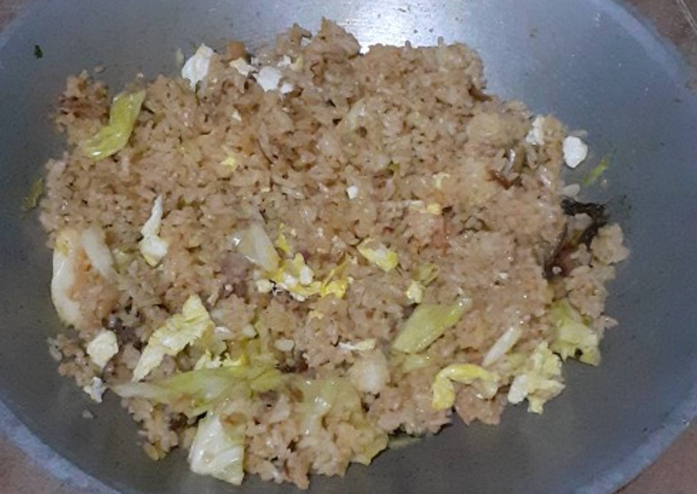 - Taburkan diatas nasi goreng dan ratakan sampai tercampur rata. Sajikan selagi hangat dan beri bawang goreng.