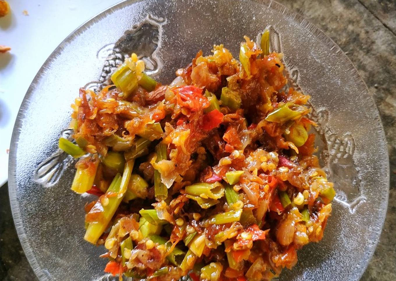 - Lalu blender kasar bahan yang sudah digoreng tadi. Tumis kembali sambal bersama dengan petai dan beri garam, kaldu jamur, gula palm, dan sedikit gula pasir. Aduk dan masak hingga matang.