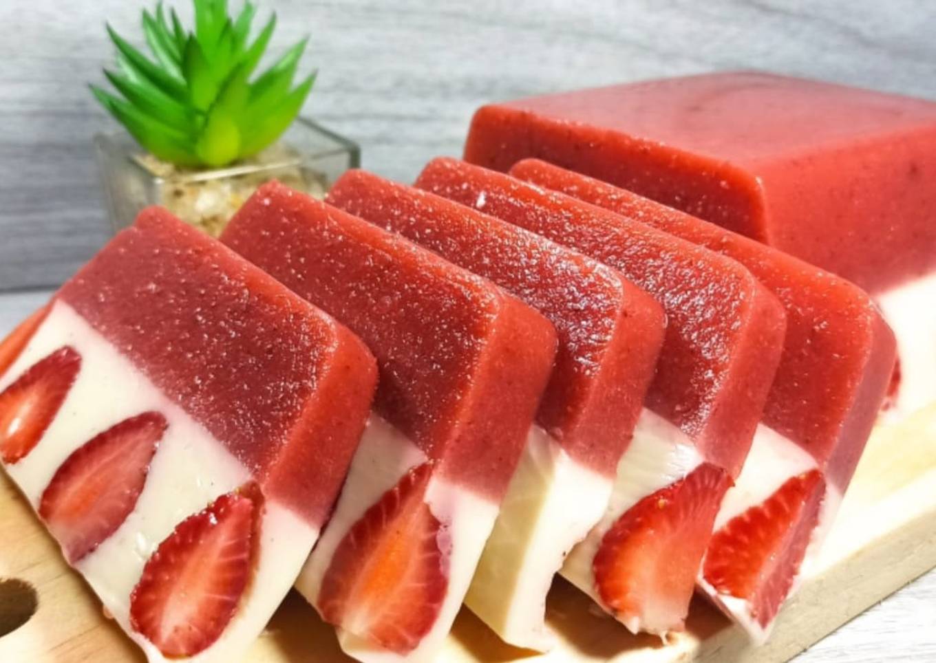 - Puding merah: blende strawberry, saring, gunakan 350 ml strawberry cair. Campur semua bahan aduk