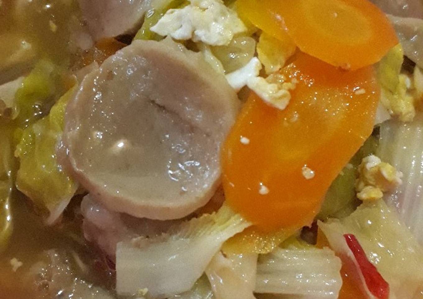 - Masukkan wortel, kubis dan bakso, tumis hingga setengah matang