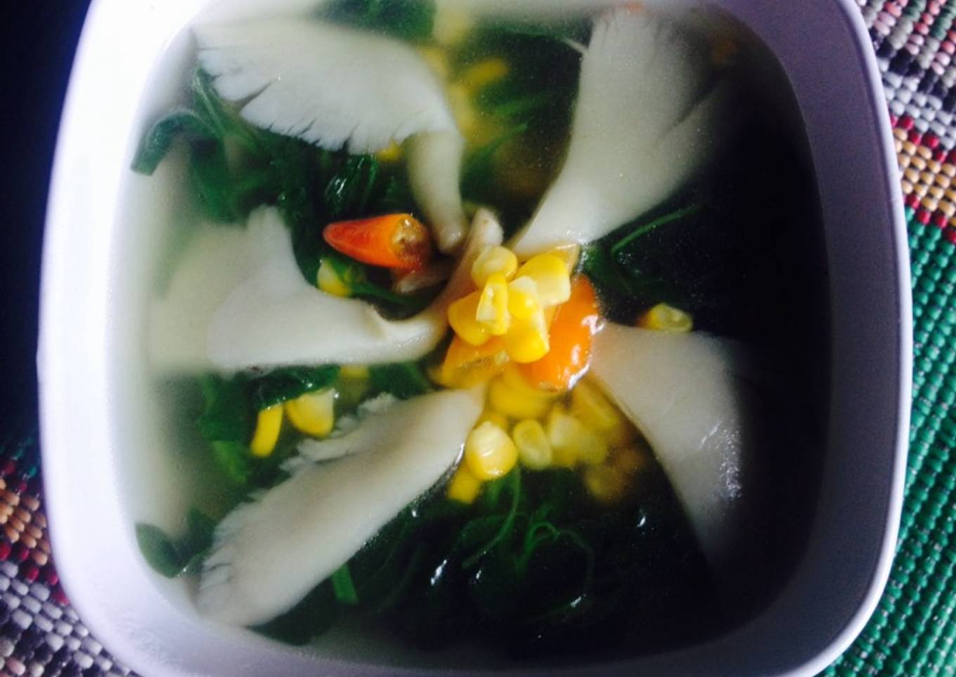 Banyak hal yang sedikit banyak berpengaruh terhadap kualitas rasa dari Sayur bening spesial (bayam,jagung,jamur), mulai dari jenis bahan, kemudian pemilihan bahan segar, sampai cara mengolah dan menghidangkannya. Tak perlu pusing kalau hendak menyiapkan Sayur bening spesial (bayam,jagung,jamur) enak di rumah, karena asal sudah tahu triknya maka hidangan ini bisa jadi sajian istimewa. Selanjutnya merupakan gambar tentang Sayur bening spesial (bayam,jagung,jamur) yang bisa sobat jadikan contoh.