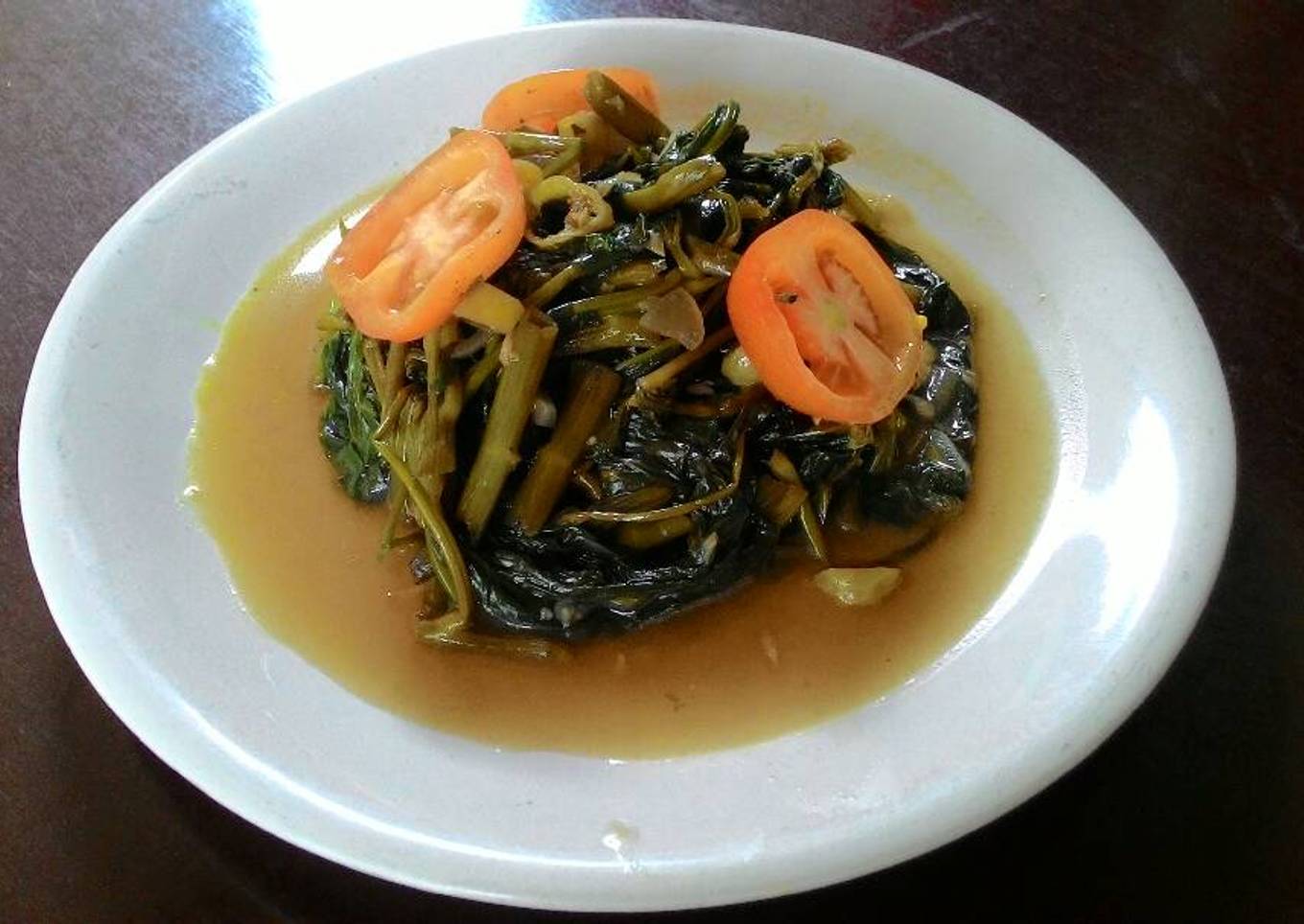 - Potong tomat ceri sesuai selera kemudian tambahkan ke dalam kangkung sebagai pelengkap. Aduk rata. Sajikan.