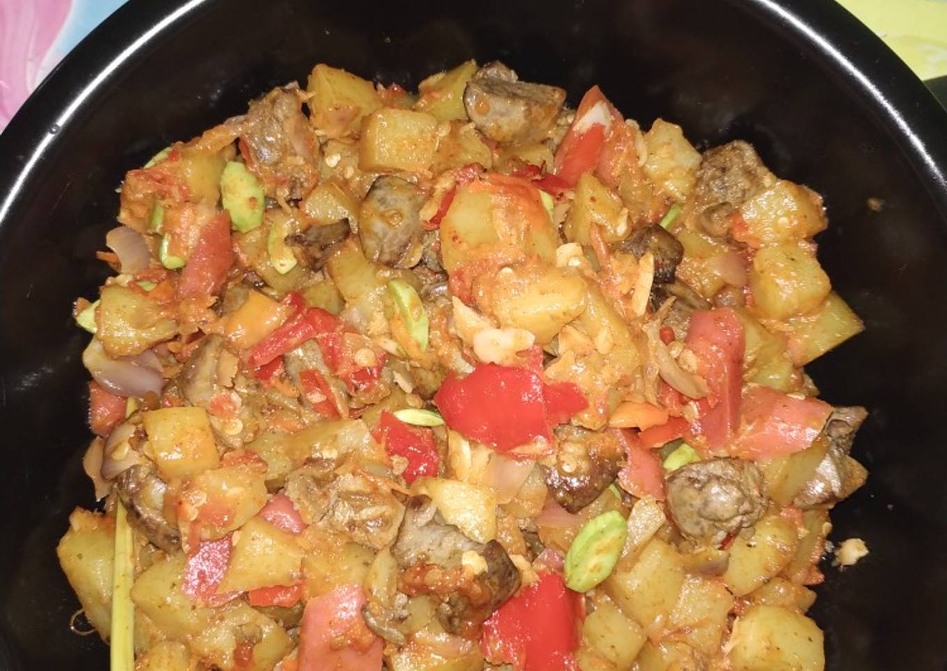 - Setelah itu masukkan kentang, kemudian hati ayam dan sosis. Aduh dan tunggu air mulai surut.