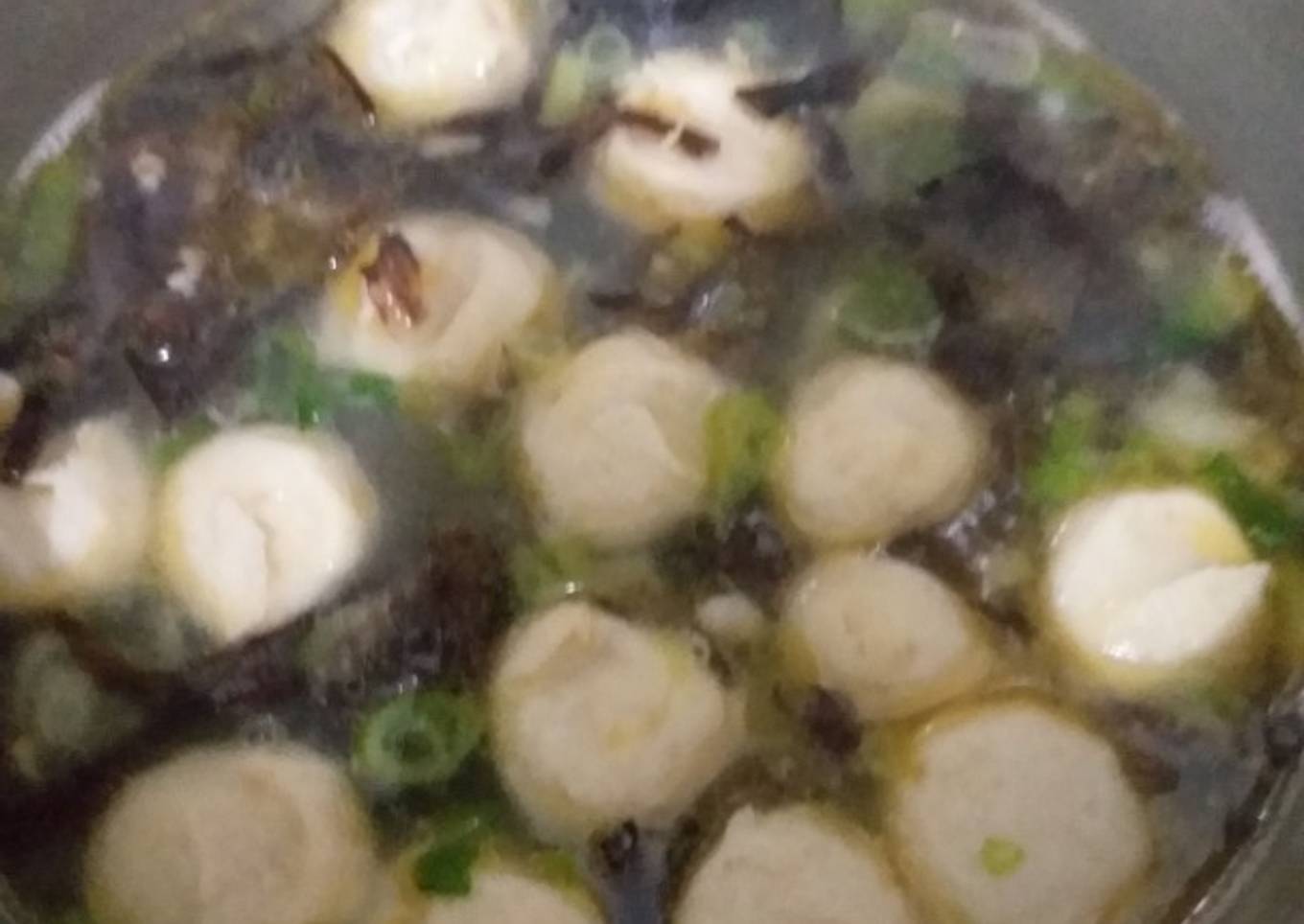 - Tuang minyak kedalam wajan, tumis bumbu halus hingga menguning masukkan udang giling, jamur kuping tumis2 sebentar lalu masukkan air sisah kaldu. Masukkan garam, kaldu jamur, merica. Tunggu mendidih masukkan baso ikannya. koreksi rasa